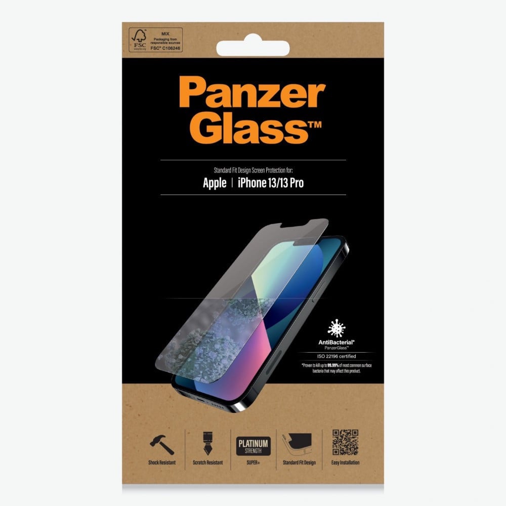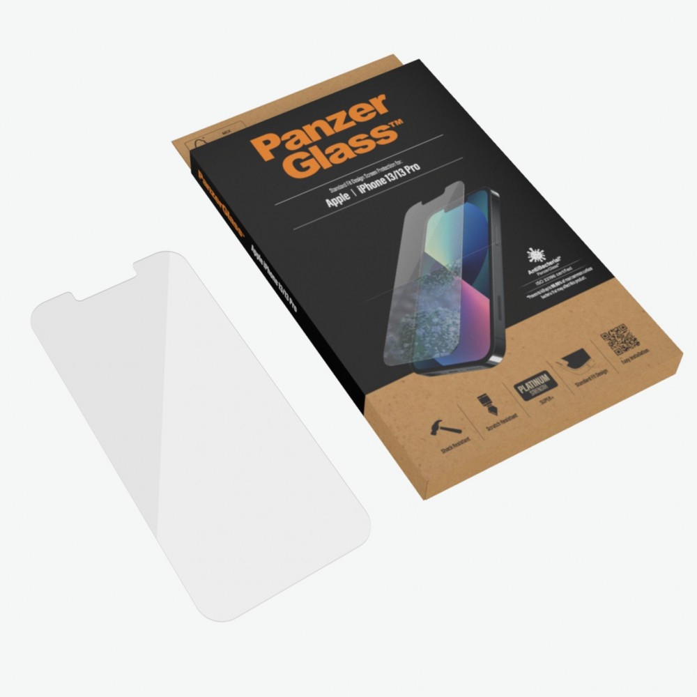 يتمتع واقي الشاشة PanzerGlass ™ لجهاز iPhone 13 و 13 Pro المزود بطلاء مضاد للجراثيم بنفس ميزات PanzerGlass ™ الأصلي وسيحمي شاشتك من الخدوش والصدمات. يتم تقليل حجم الزجاج Standard Fit ويتميز بغراء سيليكون كامل يمنح حساسية مثالية للمس مع الاستمرار في توفير قوة PanzerGlass ™ الفائقة.